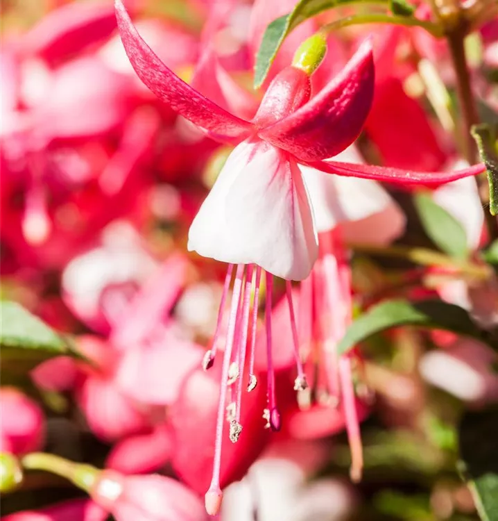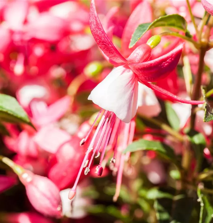 Eine pflegeleichte Pflanze außergewöhnlicher Blütenpracht, die sich in ihrer Farbgebung divers zeigt: Genau diese Merkmale treffen auf die Vertreter der Fuchsien zu. Unterschiedlichste Wuchsformen aufrechter bis überhängender Triebe prädestinieren diese Pflanzen für die verschiedensten Verwendungsmöglichkeiten. Von der Krone bis hin zum Stiel können die hängenden, auffälligen Blüten die unterschiedlichste Farbe tragen.