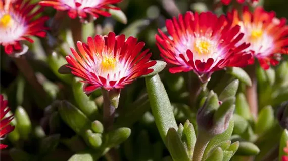 Die dickfleischigen, immergrünen Blätter der Delosperma sind saftig grün. Vertreter wie die Mittagsblumen zeichnen sich zudem durch einen niedrigen Wuchs und ihre teppichartige Ausbreitung aus. Bei einer maximalen Höhe von unter zehn Zentimetern, sind sie ideal als Bodendecker geeignet. Neben ihren Wuchseigenschaften sind jedoch auch die wunderschönen, auffälligen Blüten der kleinen Exoten nennenswert. Egal, ob die gelben, röhrenförmigen Blüten der Mittagsblumen oder die körbchenartigen, unterschiedlich farbigen Blüten der Winterharten Eisblumen dem eigenen Geschmack mehr entsprechen – jede dieser Pflanzen bietet unzählige Gestaltungsmöglichkeiten für den eigenen Steingarten. Dabei zeigen sich die sukkulenten, also dickfleischigen, Pflanzen äußerst anspruchslos: Ein sonniger Standort und ein trockener, durchnässter Boden genügt, damit die aus Afrika stammenden Pflanzen prächtig gedeihen. Unter diesen Standortbedingungen erfordern die Stauden kaum Pflege und müssen lediglich vor Stau- und Winternässe geschützt werden. Im Zweifelsfall kann eine einfache Drainage (also eine Entwässerungsanlage) sicherstellen, dass die wunderschönen Exoten keine nassen Füße bekommen.
