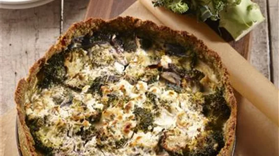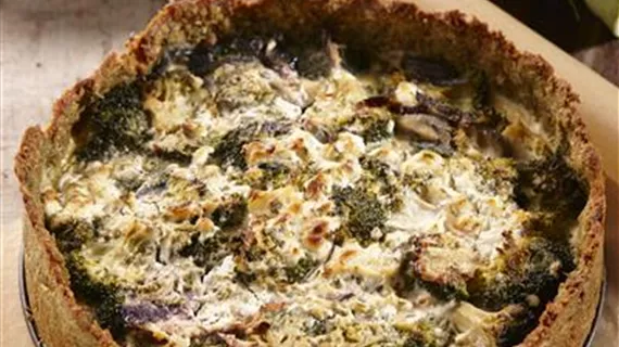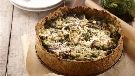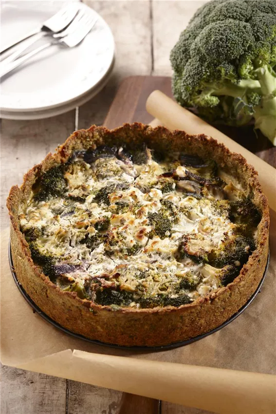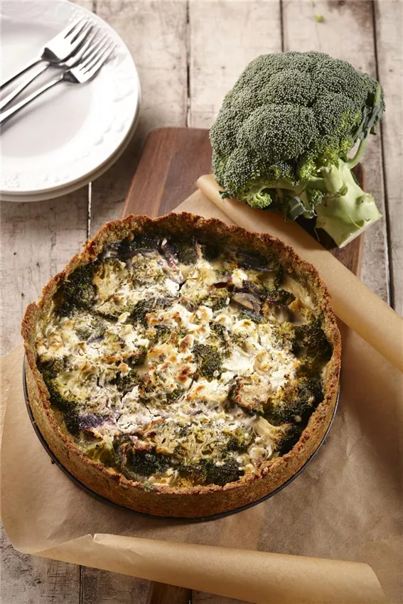 Die Form aus dem Ofen nehmen und die Masse mit Brokkoli darüber verteilen. Dann wieder in den Ofen schieben und weitere 30 Minuten fertig backen. Die Quiche zum Servieren in Kuchenstücke schneiden.