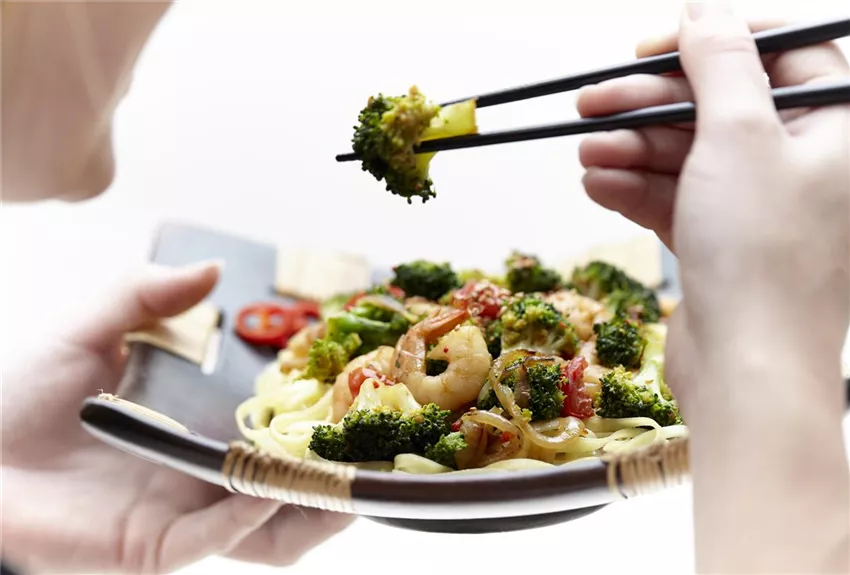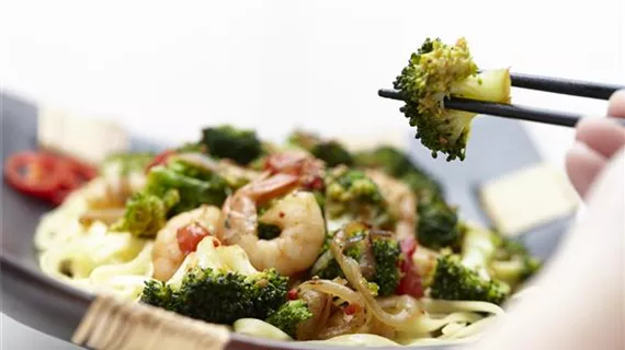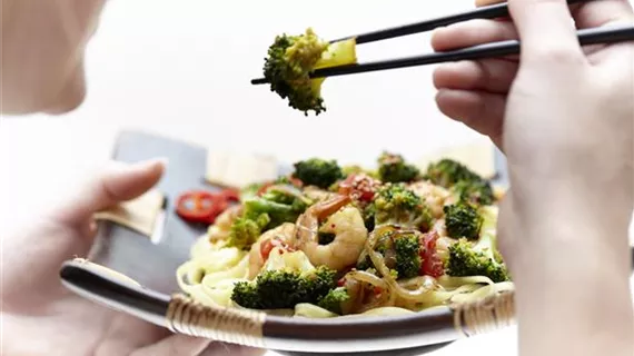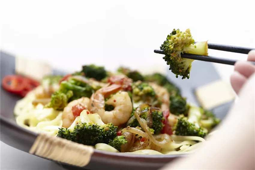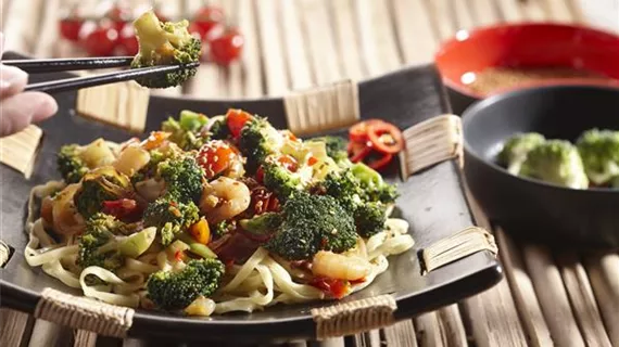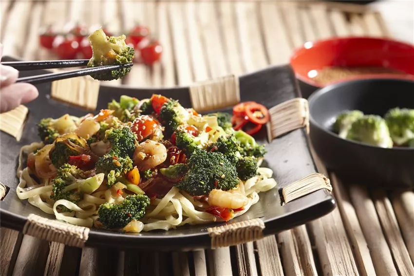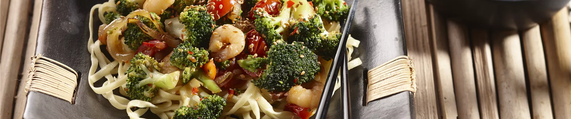Die Sesamkörner in einer Pfanne kurz anrösten und dann abkühlen lassen. Das restliche Öl in einem Wok erhitzen, die Zwiebeln schälen, in Ringe schneiden und dann darin andünsten. Tomaten, Brokkoli und die Garnelen hinzugeben und für ca. 5 Minuten unter ständigem Wenden anbraten.