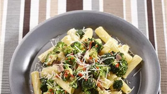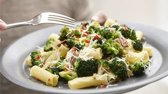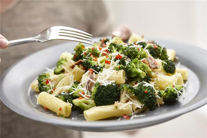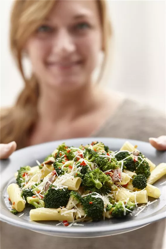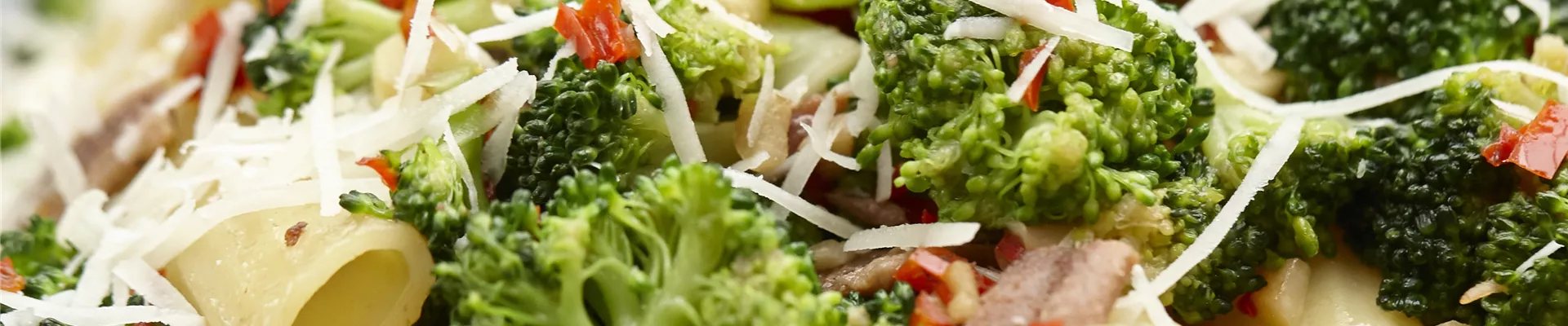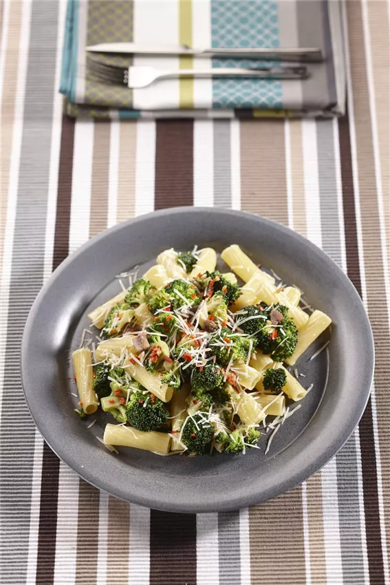 Dann den Brokkoli und die Sardellen hinzufügen und kurz mitbraten. Nudeln auf einem Teller anrichten und das Gemüse dazu geben. Zum Garnieren noch mit Käse bestreuen.